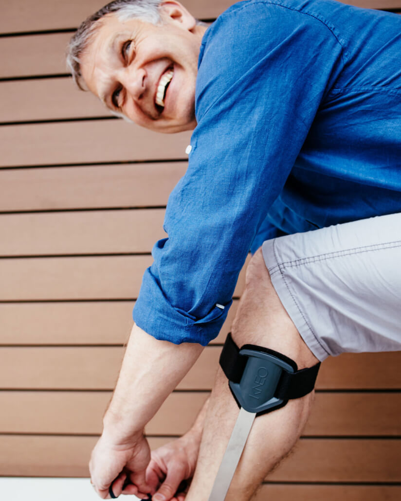 Anders als die meisten Knieorthesen wird die KNEO nicht direkt am Knie getragen. Sie sitzt knapp darunter und erstreckt sich bis zum Fuß. Durch den langen Hebelarm und das Eigengewicht des Körpers wirkt sie entlastend auf das Knie.